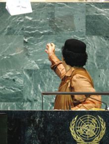 في أول كلمة له أمام الجمعية العامة للأمم المتحدة منذ 40 عاما، مزق الرئيس الليبي معمر القذافي جزءا من ميثاق الأمم المتحدة أمس، وقذف بالكتاب الأبيض في الهواء، بعد أن وصفه بأنه يتضمن حل القضية الفلسطينية.
